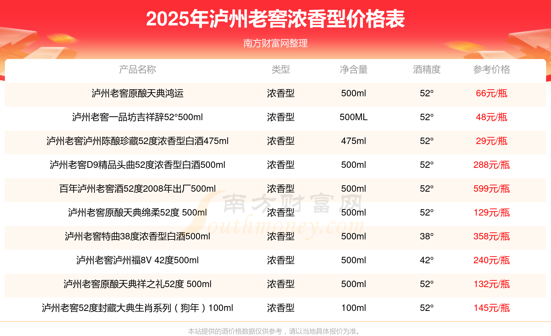 瀘州老窖濃香型酒最新價(jià)格2025:瀘州老窖國(guó)窖1573春釀鼠兆豐年E 55度參考價(jià)17999元/瓶、瀘州老窖國(guó)窖1573生命中的那壇酒55度014參考價(jià)9999元/瓶、瀘州老窖國(guó)窖1573春釀鼠兆豐年A 55度參考價(jià)5088元/瓶、瀘州老窖國(guó)窖1573生命中的那壇酒55度013濃香型白酒1000ml參考價(jià)4988元/瓶。
