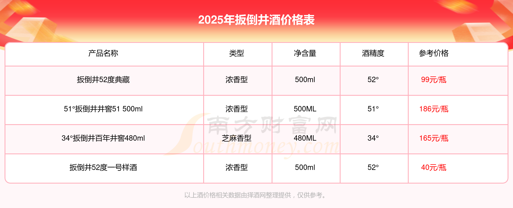 2025年,51°扳倒井井窖51 500ml、34°扳倒井百年井窖480ml、扳倒井52度典藏、扳倒井52度一號樣酒等扳倒井酒價格如下:51°扳倒井井窖51 500ml參考價186元/瓶、34°扳倒井百年井窖480ml參考價165元/瓶、扳倒井52度典藏參考價99元/瓶、扳倒井52度一號樣酒參考價40元/瓶。