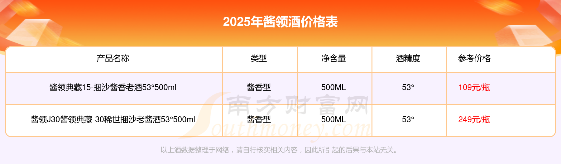 醬領(lǐng)J30醬領(lǐng)典藏-30稀世捆沙老醬酒53°500ml參考價249元/瓶、醬領(lǐng)典藏15-捆沙醬香老酒53°500ml參考價109元/瓶。