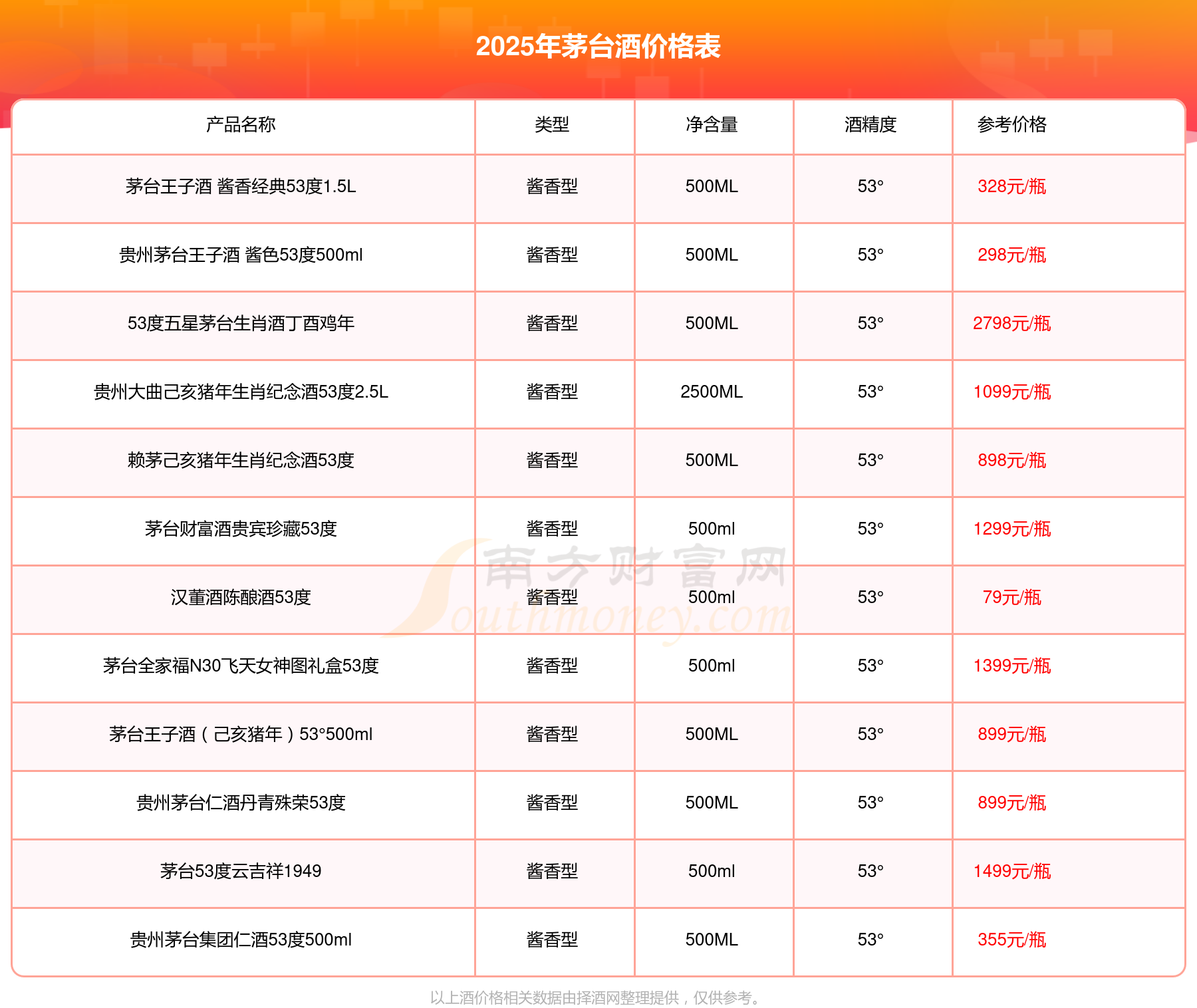 2025茅臺(tái)酒最新價(jià)格:華茅鑒藏 醬香型白酒 3L 53°參考價(jià)8388元/瓶、53度五星茅臺(tái)生肖酒丁酉雞年參考價(jià)2798元/瓶、貴州茅臺(tái)己亥豬年生肖酒53°500ml參考價(jià)2699元/瓶、53度五星茅臺(tái)生肖酒戊戌狗年參考價(jià)2698元/瓶、飛天茅臺(tái)53°500ml(2015年)參考價(jià)2199元/瓶、茅臺(tái)王子酒己亥豬年生肖紀(jì)念酒53度2.5L參考價(jià)2099元/瓶、茅臺(tái)1935醬香型53度參考價(jià)1799元/瓶、茅臺(tái)財(cái)富貴賓典藏酒53度參考價(jià)1599元/瓶。