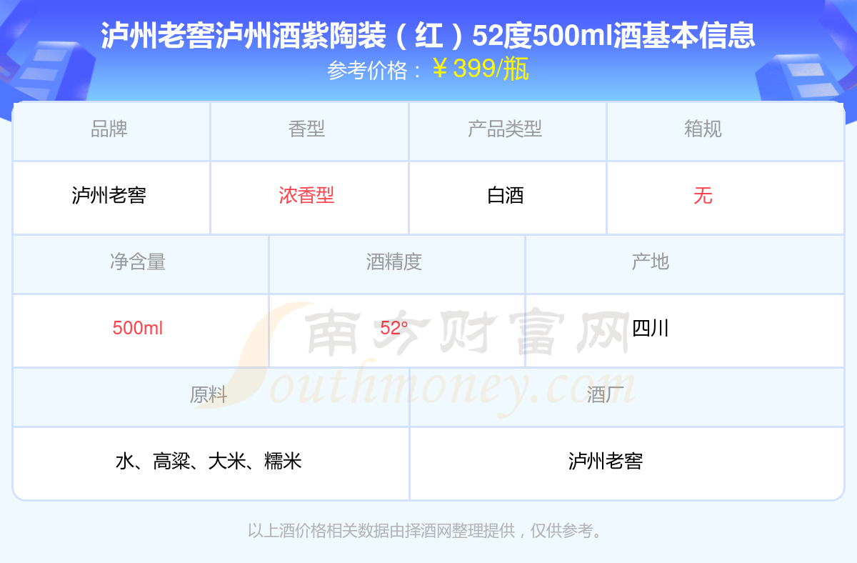 瀘州老窖瀘州酒紫陶裝(紅)52度500ml基本信息