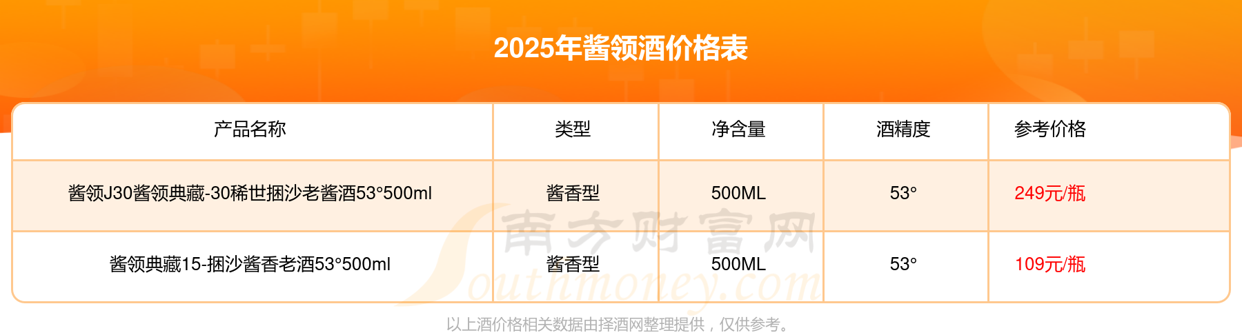 醬領(lǐng)J30醬領(lǐng)典藏-30稀世捆沙老醬酒53°500ml參考價249元/瓶、醬領(lǐng)典藏15-捆沙醬香老酒53°500ml參考價109元/瓶。