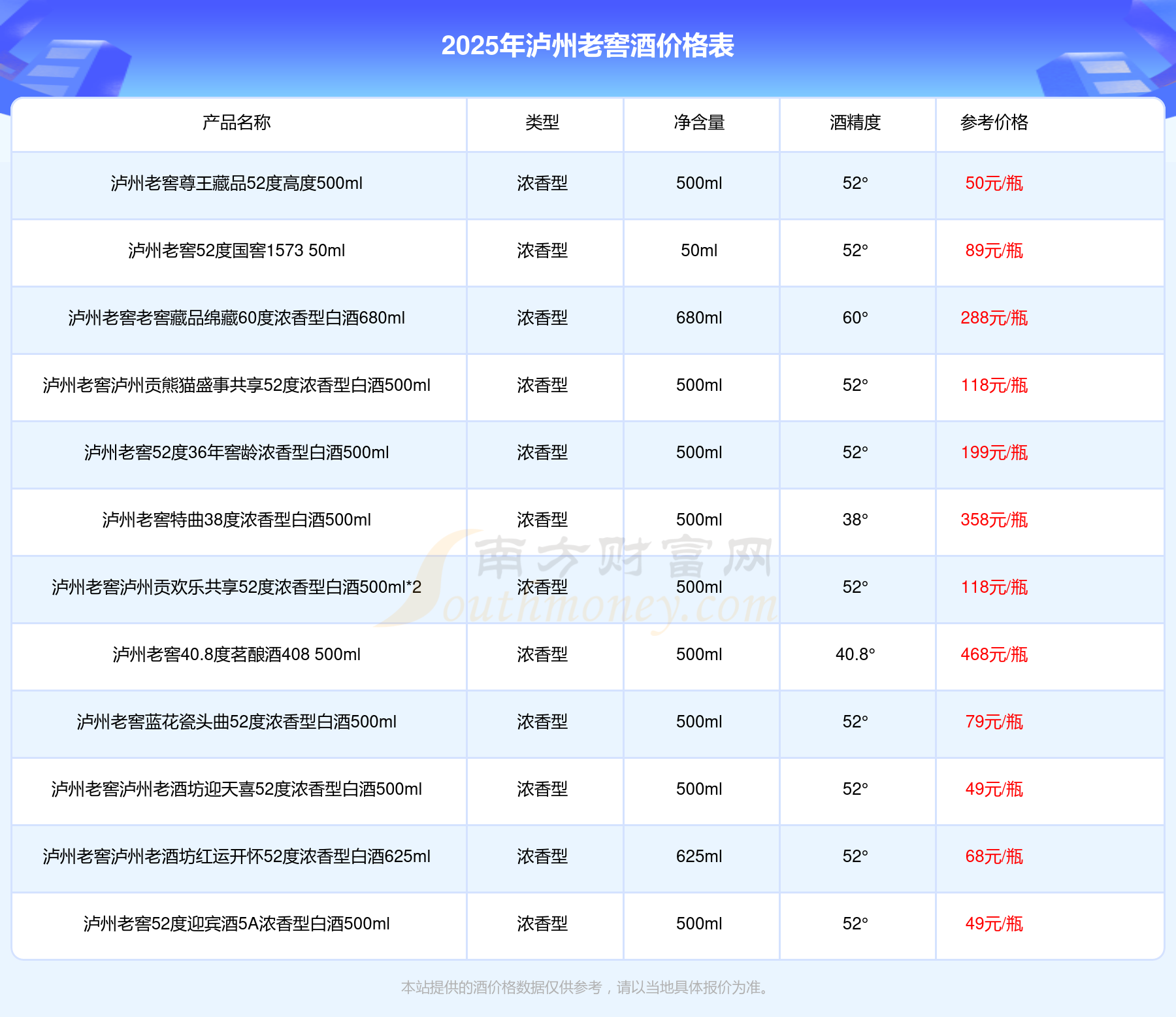 2025瀘州老窖酒最新價格:瀘州老窖國窖1573春釀鼠兆豐年E 55度參考價17999元/瓶、瀘州老窖國窖1573生命中的那壇酒55度014參考價9999元/瓶、瀘州老窖國窖1573春釀鼠兆豐年A 55度參考價5088元/瓶、瀘州老窖國窖1573生命中的那壇酒55度013濃香型白酒1000ml參考價4988元/瓶、瀘州老窖國窖1573生命中的那壇酒55度009 1000ml參考價4288元/瓶、瀘州老窖國窖1573中國品味52度濃香型白酒500ml參考價2888元/瓶、瀘州老窖國窖1573許燎源概念作品58度濃香型白酒1000ml參考價2680元/瓶。