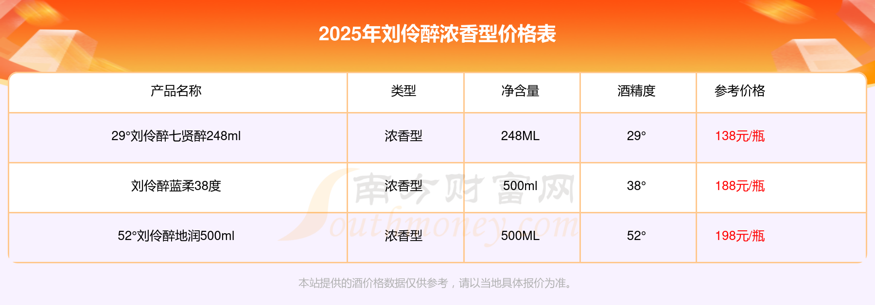 劉伶醉濃香型酒最新價(jià)格2025:52°劉伶醉地潤(rùn)500ml參考價(jià)198元/瓶、劉伶醉藍(lán)柔38度參考價(jià)188元/瓶、29°劉伶醉七賢醉248ml參考價(jià)138元/瓶。