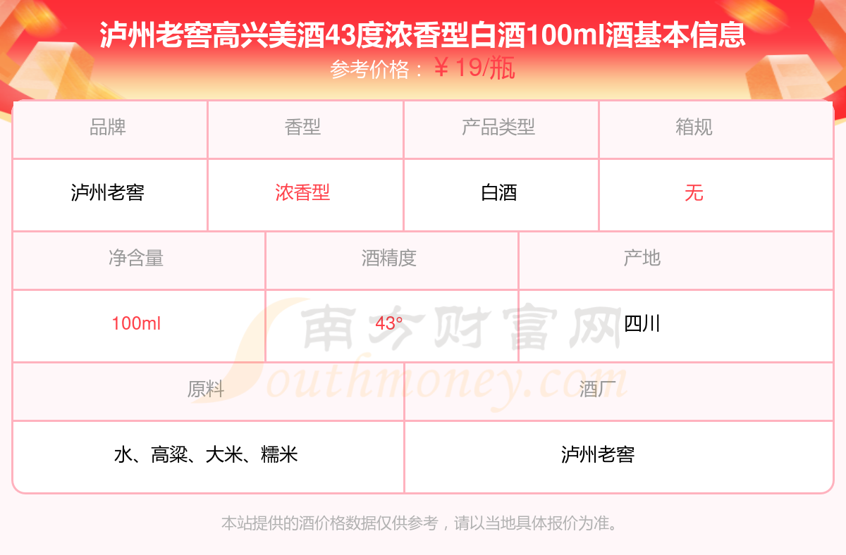 瀘州老窖高興美酒43度濃香型白酒100ml基本信息