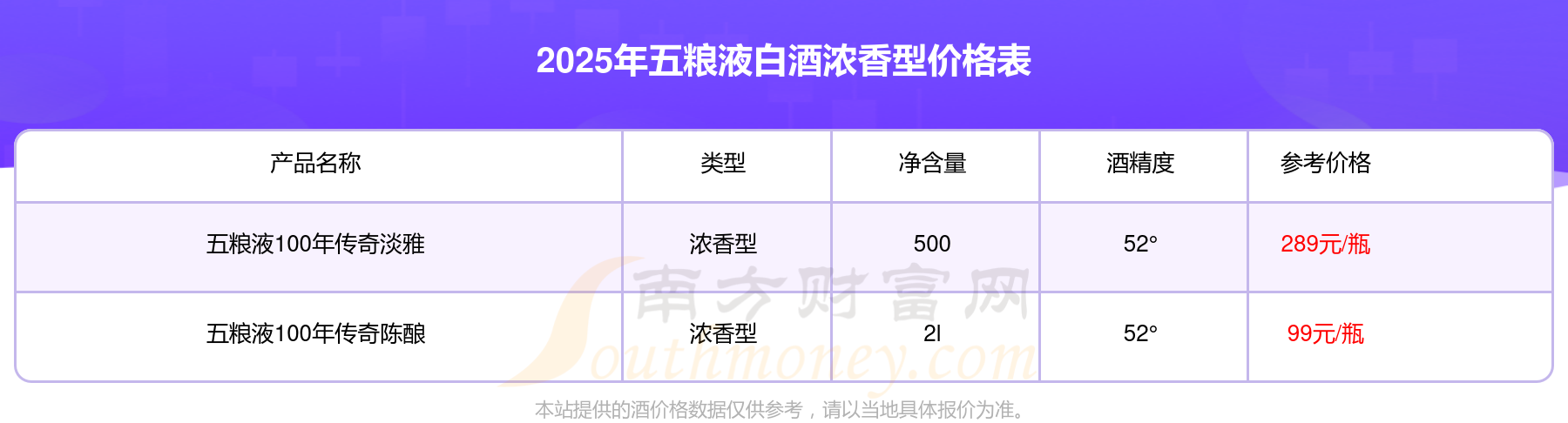 2025五糧液白酒濃香型酒最新價格:五糧液100年傳奇淡雅參考價289元/瓶、五糧液100年傳奇陳釀參考價99元/瓶。