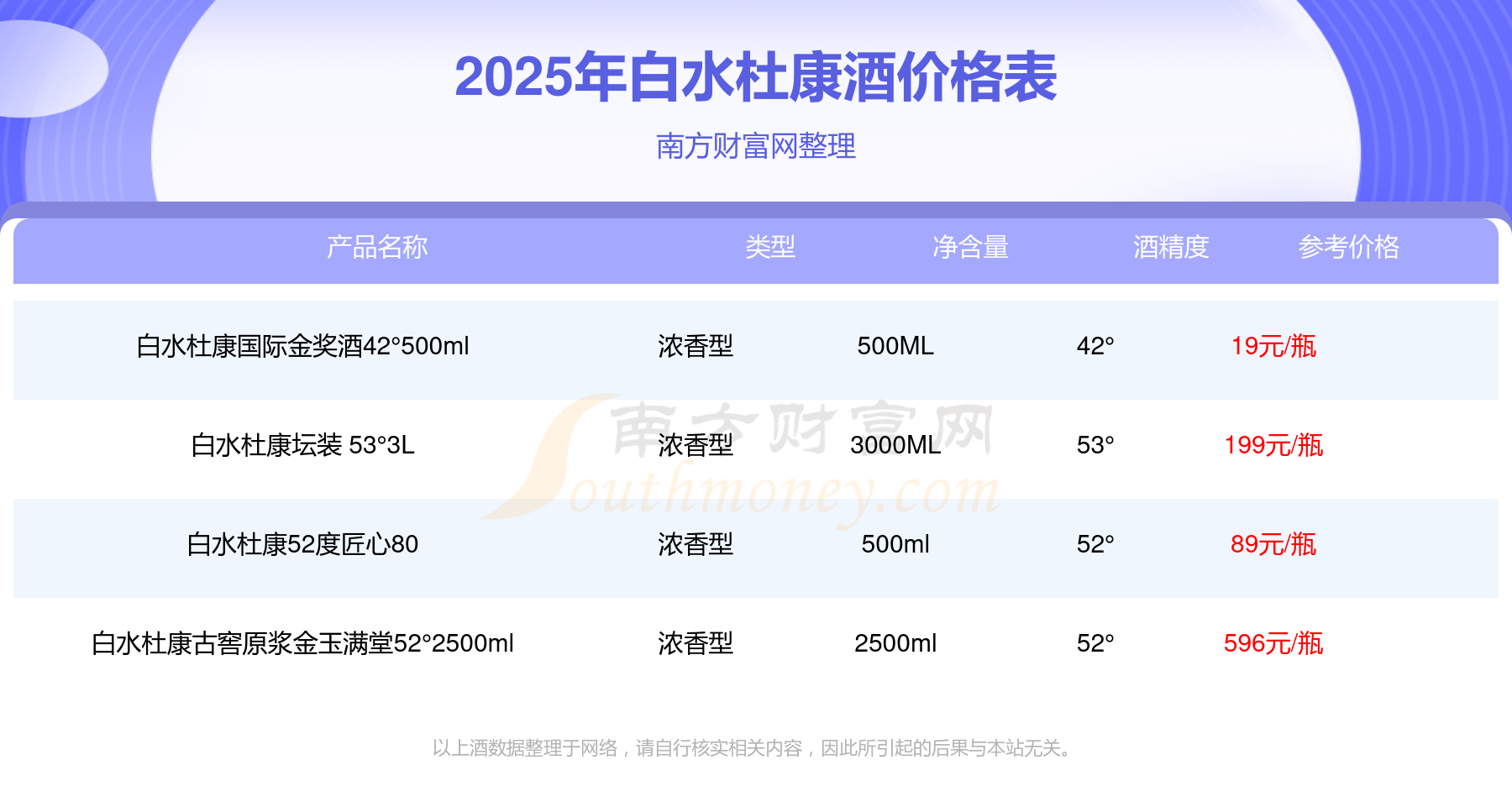 2025白水杜康酒最新價(jià)格:白水杜康古窖原漿金玉滿堂52°2500ml參考價(jià)596元/瓶、白水杜康壇裝 53°3L參考價(jià)199元/瓶、白水杜康52度匠心80參考價(jià)89元/瓶、白水杜康國際金獎(jiǎng)酒42°500ml參考價(jià)19元/瓶。