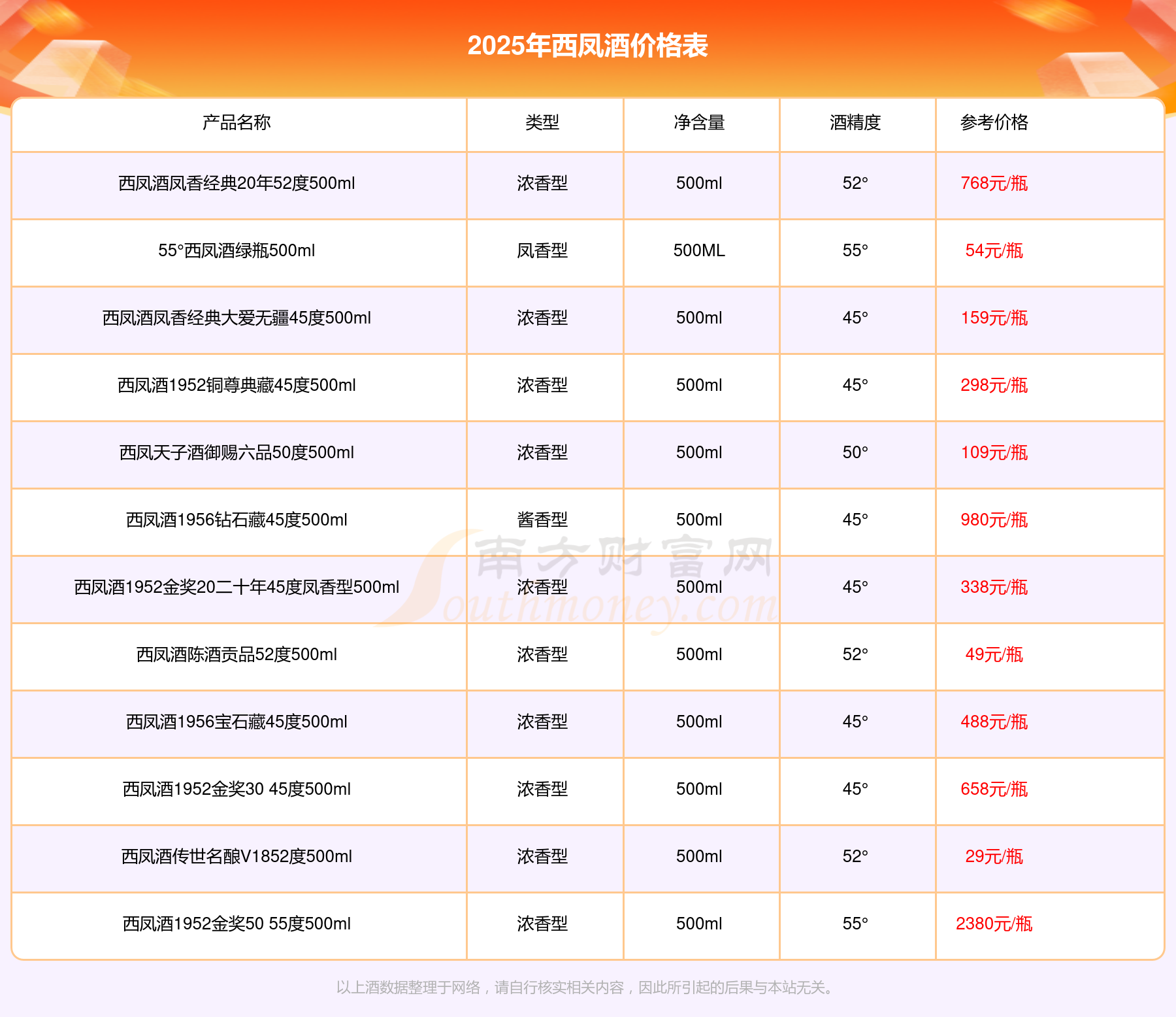 2025西鳳酒最新價(jià)格:西鳳酒 酒海私藏55度3000ml參考價(jià)8880元/瓶、西鳳酒1952金獎(jiǎng)50 55度500ml參考價(jià)2380元/瓶、西鳳酒2013年產(chǎn)老酒鳳香經(jīng)典30年52度500ml參考價(jià)1280元/瓶、西鳳酒1956鉆石藏45度500ml參考價(jià)980元/瓶、西鳳酒1952金獎(jiǎng)30 55度500ml參考價(jià)898元/瓶、西鳳酒鳳香經(jīng)典20年52度500ml參考價(jià)768元/瓶。