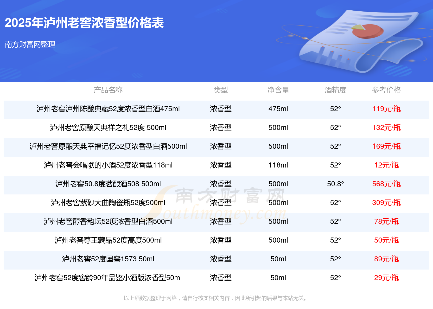 2025年,瀘州老窖國窖1573春釀鼠兆豐年E 55度、瀘州老窖國窖1573生命中的那壇酒55度014、瀘州老窖國窖1573春釀鼠兆豐年A 55度、瀘州老窖國窖1573生命中的那壇酒55度013濃香型白酒1000ml、瀘州老窖國窖1573生命中的那壇酒55度009 1000ml、瀘州老窖國窖1573中國品味52度濃香型白酒500ml等瀘州老窖濃香型酒價格如下:瀘州老窖國窖1573春釀鼠兆豐年E 55度參考價17999元/瓶、瀘州老窖國窖1573生命中的那壇酒55度014參考價9999元/瓶、瀘州老窖國窖1573春釀鼠兆豐年A 55度參考價5088元/瓶、瀘州老窖國窖1573生命中的那壇酒55度013濃香型白酒1000ml參考價4988元/瓶、瀘州老窖國窖1573生命中的那壇酒55度009 1000ml參考價4288元/瓶、瀘州老窖國窖1573中國品味52度濃香型白酒500ml參考價2888元/瓶。