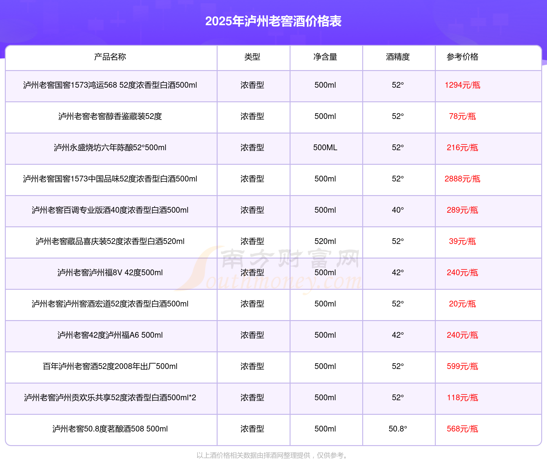 2025年,瀘州老窖國窖1573春釀鼠兆豐年E 55度、瀘州老窖國窖1573生命中的那壇酒55度014、瀘州老窖國窖1573春釀鼠兆豐年A 55度、瀘州老窖國窖1573生命中的那壇酒55度013濃香型白酒1000ml、瀘州老窖國窖1573生命中的那壇酒55度009 1000ml、瀘州老窖國窖1573中國品味52度濃香型白酒500ml、瀘州老窖國窖1573許燎源概念作品58度濃香型白酒1000ml等瀘州老窖酒價格如下:瀘州老窖國窖1573春釀鼠兆豐年E 55度參考價17999元/瓶、瀘州老窖國窖1573生命中的那壇酒55度014參考價9999元/瓶、瀘州老窖國窖1573春釀鼠兆豐年A 55度參考價5088元/瓶、瀘州老窖國窖1573生命中的那壇酒55度013濃香型白酒1000ml參考價4988元/瓶、瀘州老窖國窖1573生命中的那壇酒55度009 1000ml參考價4288元/瓶、瀘州老窖國窖1573中國品味52度濃香型白酒500ml參考價2888元/瓶、瀘州老窖國窖1573許燎源概念作品58度濃香型白酒1000ml參考價2680元/瓶。