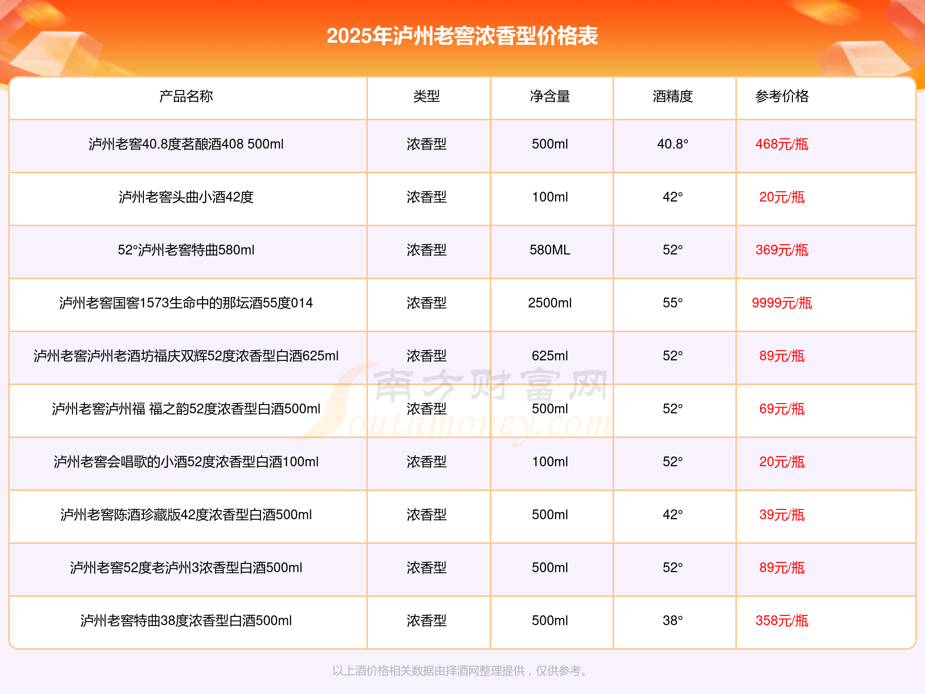 瀘州老窖濃香型酒最新價格2025:瀘州老窖國窖1573春釀鼠兆豐年E 55度參考價17999元/瓶、瀘州老窖國窖1573生命中的那壇酒55度014參考價9999元/瓶、瀘州老窖國窖1573春釀鼠兆豐年A 55度參考價5088元/瓶。