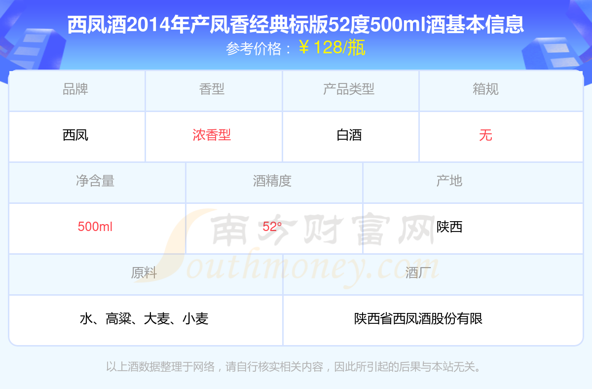西鳳酒2014年產(chǎn)鳳香經(jīng)典標(biāo)版52度500ml基本信息