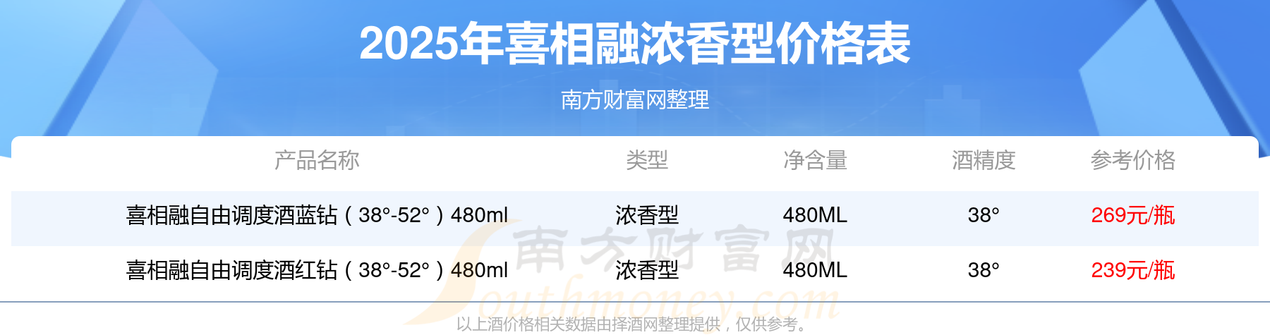 2025年,喜相融自由調(diào)度酒藍(lán)鉆(38°-52°)480ml、喜相融自由調(diào)度酒紅鉆(38°-52°)480ml等喜相融濃香型酒價格如下:喜相融自由調(diào)度酒藍(lán)鉆(38°-52°)480ml參考價269元/瓶、喜相融自由調(diào)度酒紅鉆(38°-52°)480ml參考價239元/瓶。