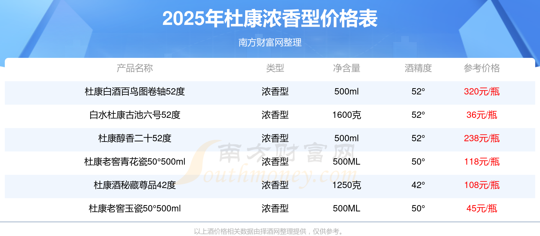 杜康白酒百鳥圖卷軸52度參考價320元/瓶、杜康醇香二十52度參考價238元/瓶、杜康老窖青花瓷50°500ml參考價118元/瓶、杜康酒秘藏尊品42度參考價108元/瓶、杜康老窖玉瓷50°500ml參考價45元/瓶、白水杜康古池六號52度參考價36元/瓶。