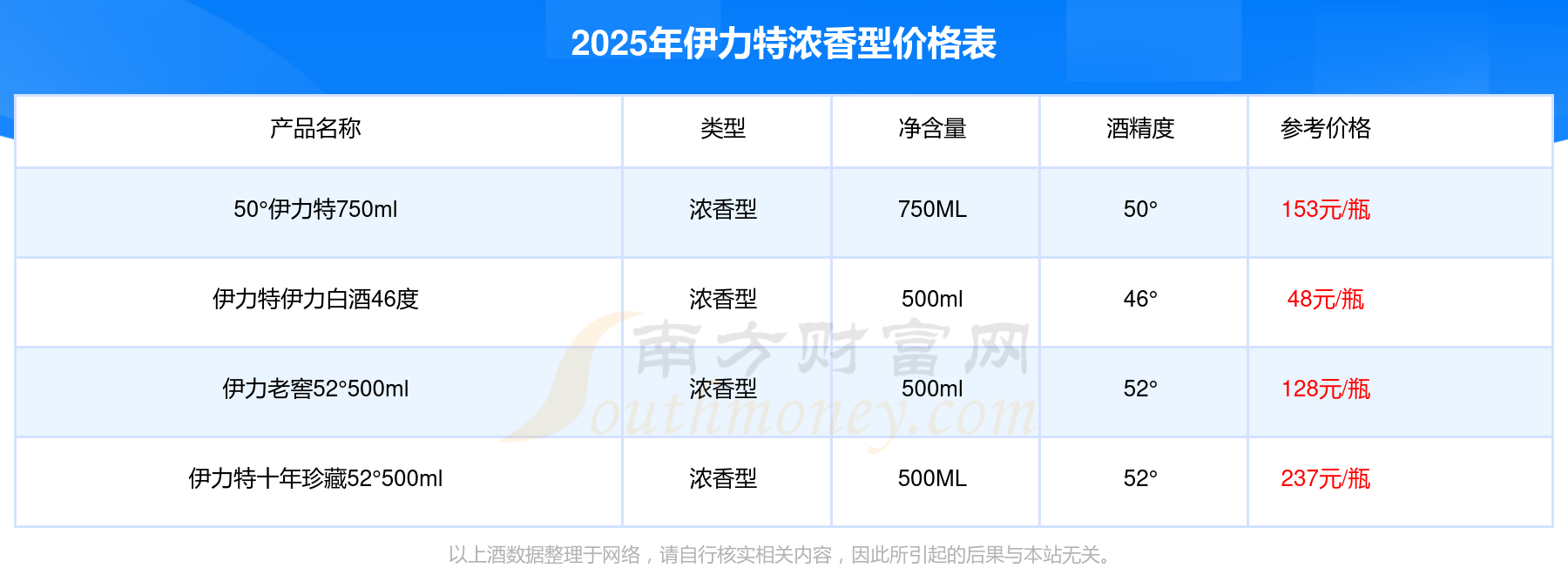2025年伊力特濃香型酒伊力特十年珍藏52°500ml、50°伊力特750ml、伊力老窖52°500ml、伊力特伊力白酒46度等最新價格如下:伊力特十年珍藏52°500ml參考價237元/瓶、50°伊力特750ml參考價153元/瓶、伊力老窖52°500ml參考價128元/瓶、伊力特伊力白酒46度參考價48元/瓶。