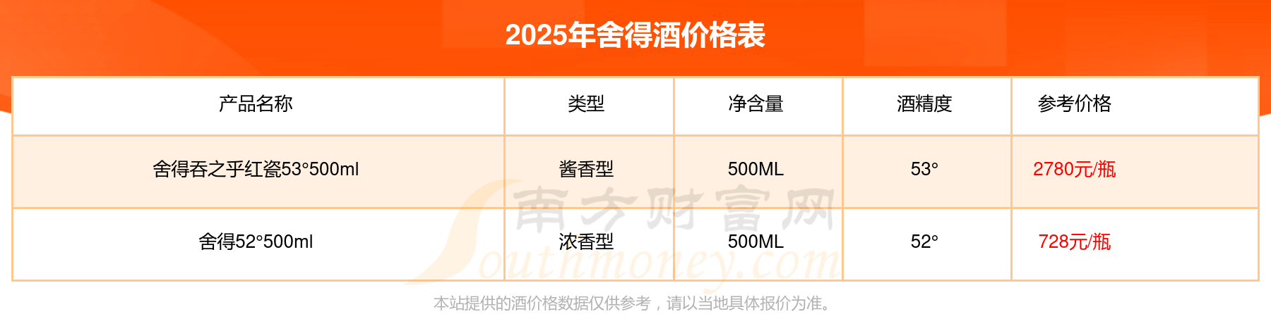 舍得吞之乎紅瓷53°500ml參考價2780元/瓶、舍得52°500ml參考價728元/瓶。