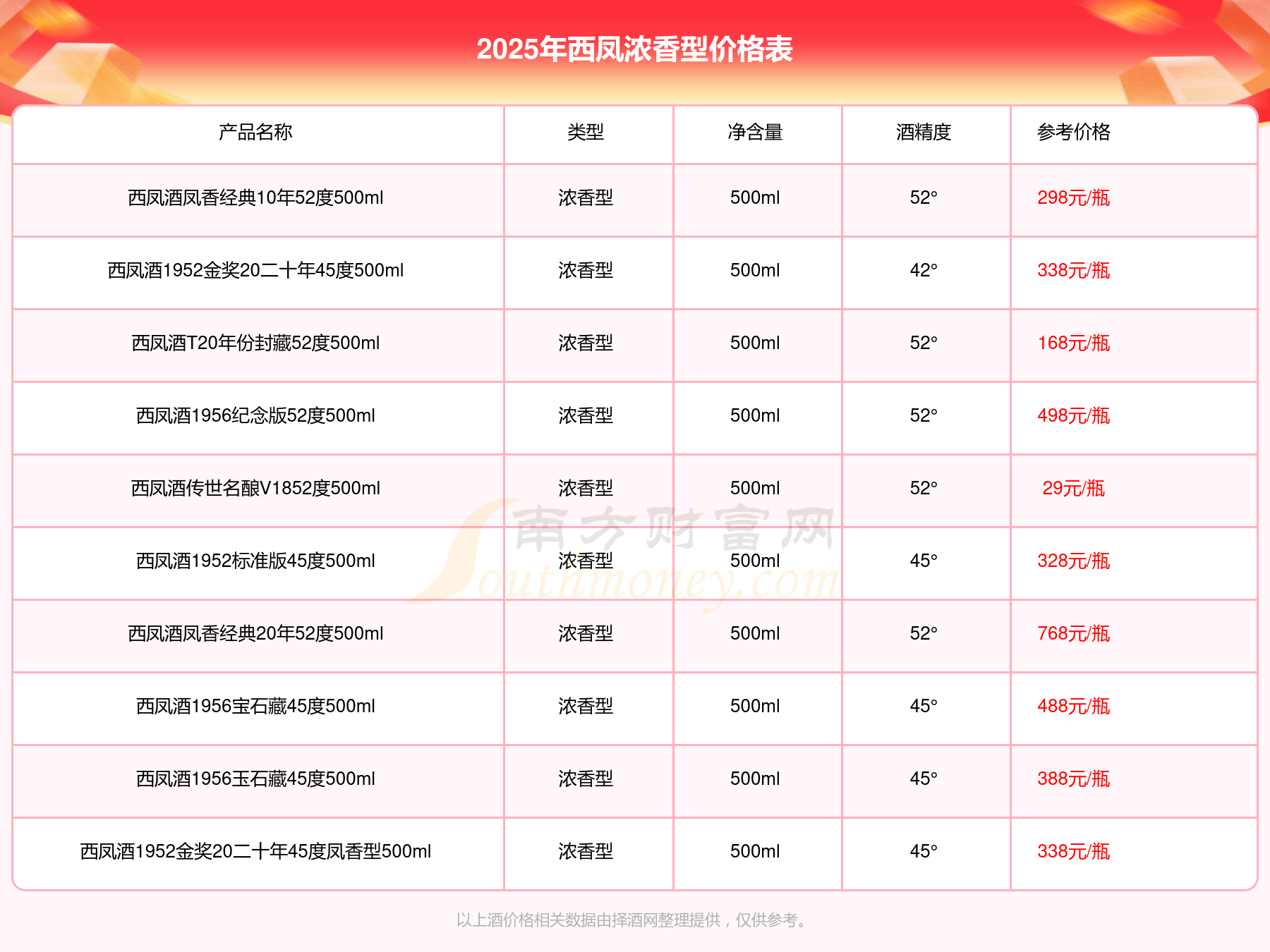 2025西鳳濃香型酒最新價格:西鳳酒 酒海私藏55度3000ml參考價8880元/瓶、西鳳酒1952金獎50 55度500ml參考價2380元/瓶、西鳳酒2013年產(chǎn)老酒鳳香經(jīng)典30年52度500ml參考價1280元/瓶、西鳳酒1952金獎30 55度500ml參考價898元/瓶、西鳳酒鳳香經(jīng)典20年52度500ml參考價768元/瓶、西鳳酒1952金獎30 45度500ml參考價658元/瓶。