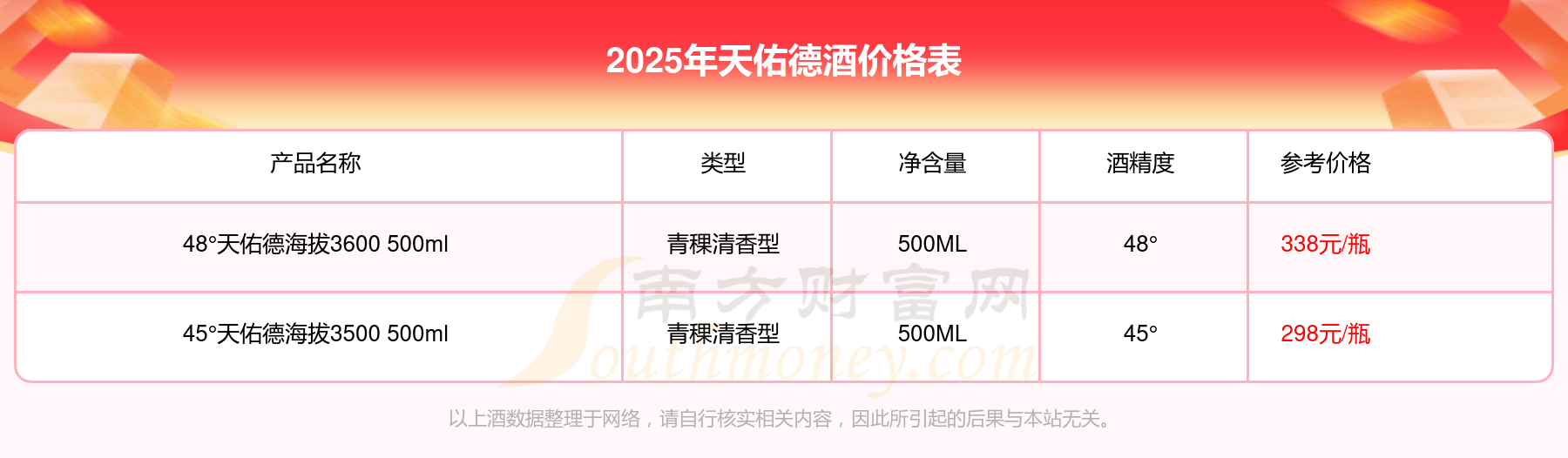 48°天佑德海拔3600 500ml參考價338元/瓶、45°天佑德海拔3500 500ml參考價298元/瓶。