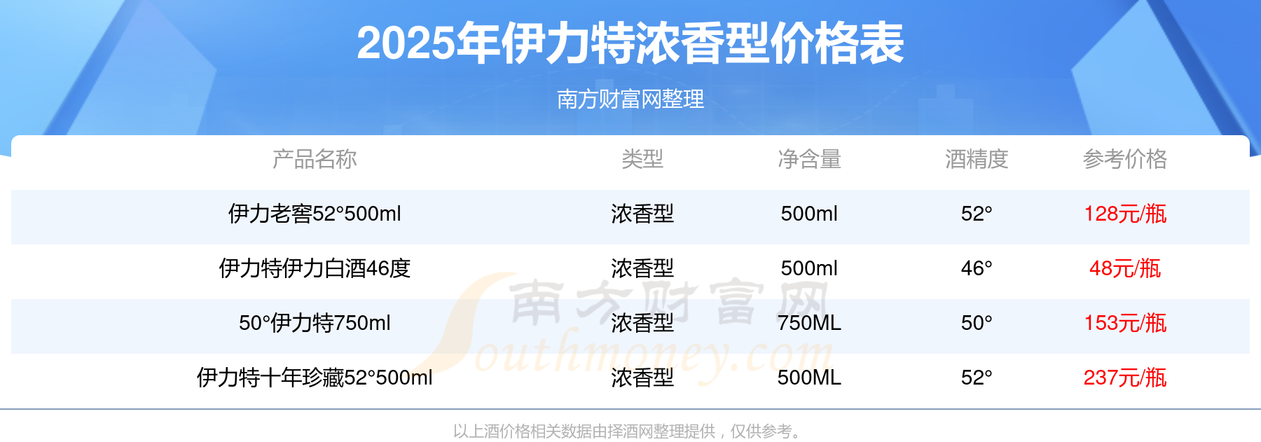 2025年,伊力特十年珍藏52°500ml、50°伊力特750ml、伊力老窖52°500ml、伊力特伊力白酒46度等伊力特濃香型酒價(jià)格如下: