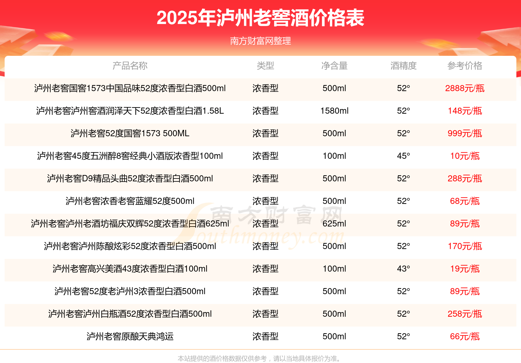 瀘州老窖國窖1573春釀鼠兆豐年E 55度參考價17999元/瓶、瀘州老窖國窖1573生命中的那壇酒55度014參考價9999元/瓶、瀘州老窖國窖1573春釀鼠兆豐年A 55度參考價5088元/瓶、瀘州老窖國窖1573生命中的那壇酒55度013濃香型白酒1000ml參考價4988元/瓶、瀘州老窖國窖1573生命中的那壇酒55度009 1000ml參考價4288元/瓶、瀘州老窖國窖1573中國品味52度濃香型白酒500ml參考價2888元/瓶、瀘州老窖國窖1573許燎源概念作品58度濃香型白酒1000ml參考價2680元/瓶、瀘州老窖52度國窖1573狗年生肖禮盒參考價2143元/瓶。