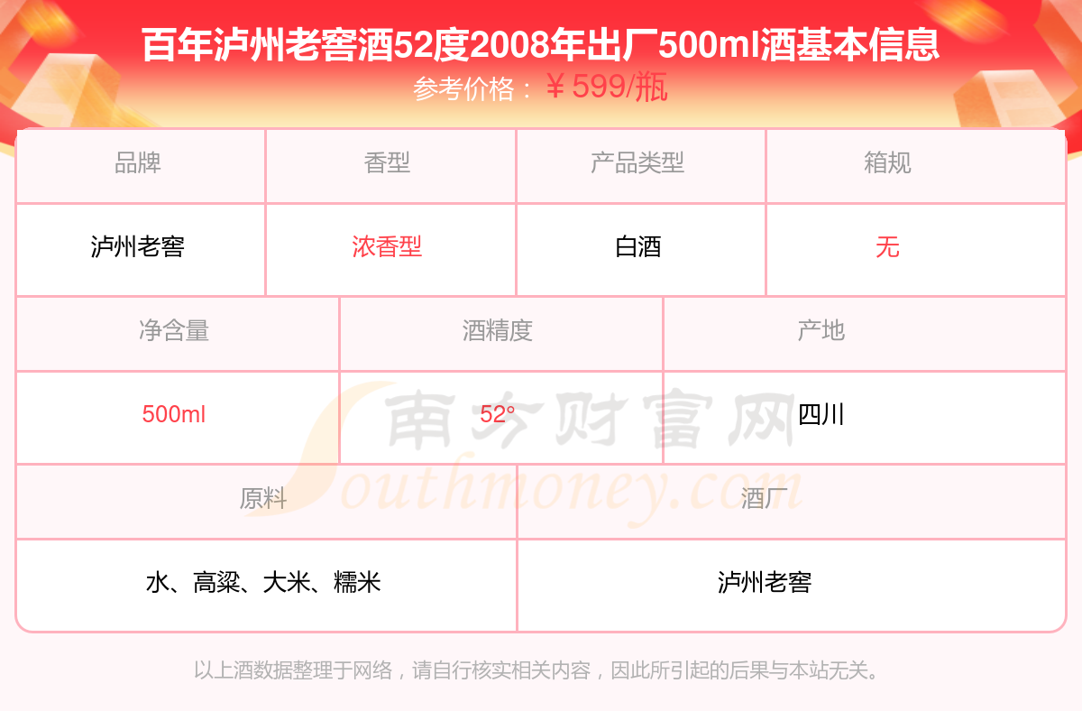 百年瀘州老窖酒52度2008年出廠500ml基本信息