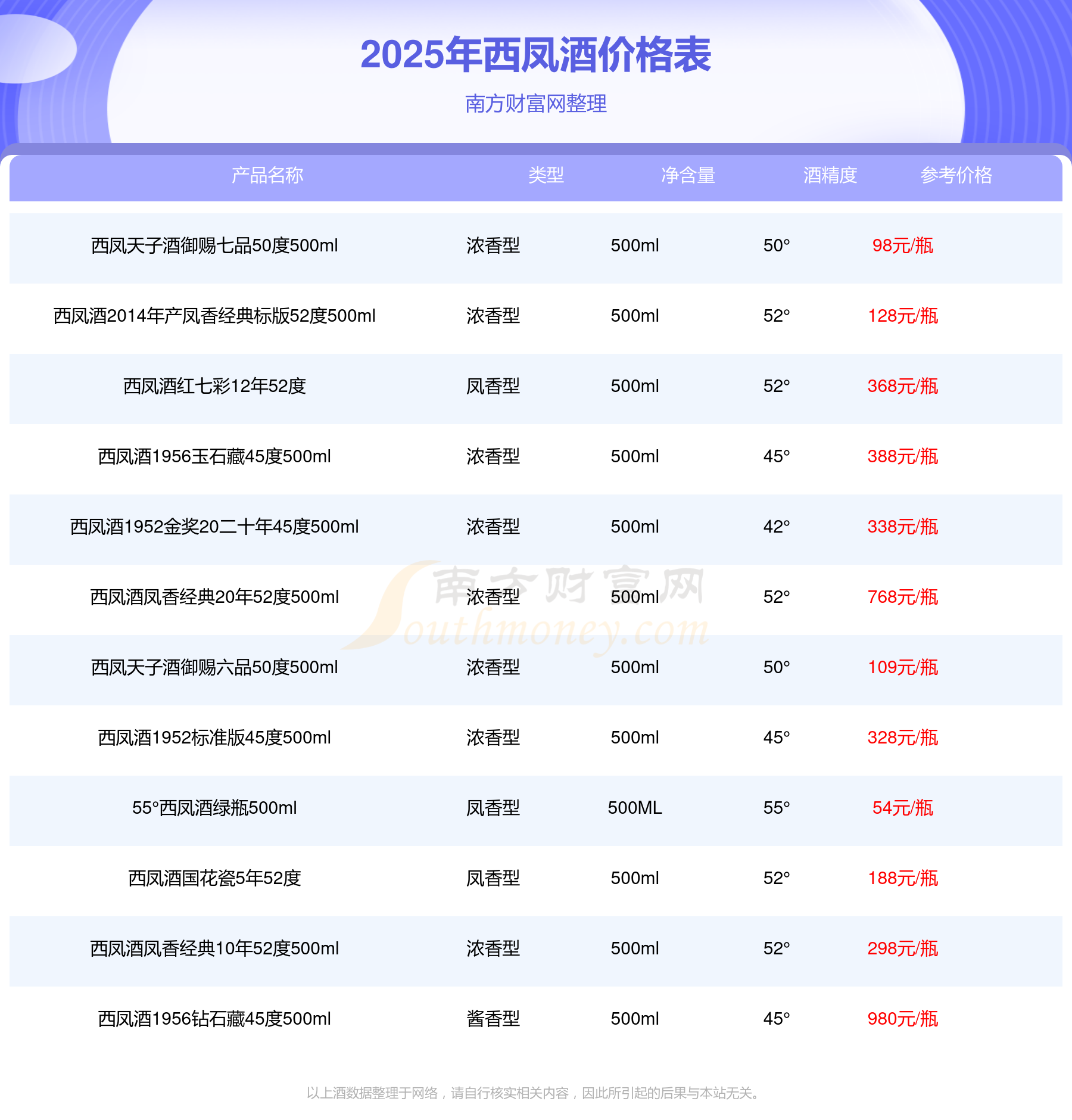 西鳳酒 酒海私藏55度3000ml參考價(jià)8880元/瓶、西鳳酒1952金獎(jiǎng)50 55度500ml參考價(jià)2380元/瓶、西鳳酒2013年產(chǎn)老酒鳳香經(jīng)典30年52度500ml參考價(jià)1280元/瓶、西鳳酒1956鉆石藏45度500ml參考價(jià)980元/瓶、西鳳酒1952金獎(jiǎng)30 55度500ml參考價(jià)898元/瓶、西鳳酒鳳香經(jīng)典20年52度500ml參考價(jià)768元/瓶、西鳳酒1952金獎(jiǎng)30 45度500ml參考價(jià)658元/瓶、西鳳酒1956紀(jì)念版52度500ml參考價(jià)498元/瓶。