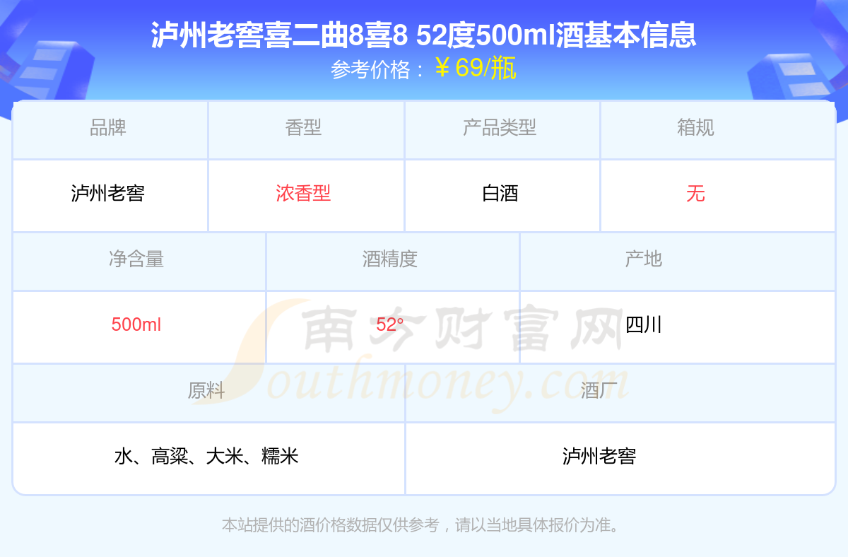 瀘州老窖喜二曲8喜8 52度500ml基本信息