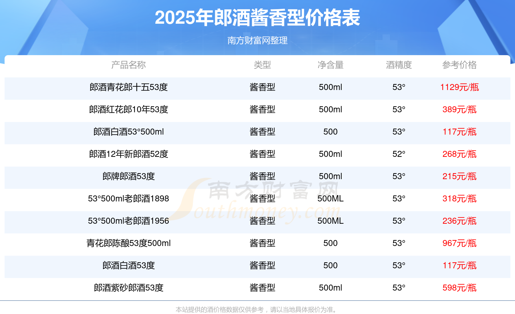 郎酒青花郎十五53度參考價1129元/瓶、青花郎陳釀53度500ml參考價967元/瓶、郎酒紫砂郎酒53度參考價598元/瓶、郎酒紅花郎10年53度參考價389元/瓶、53°500ml老郎酒1898參考價318元/瓶。