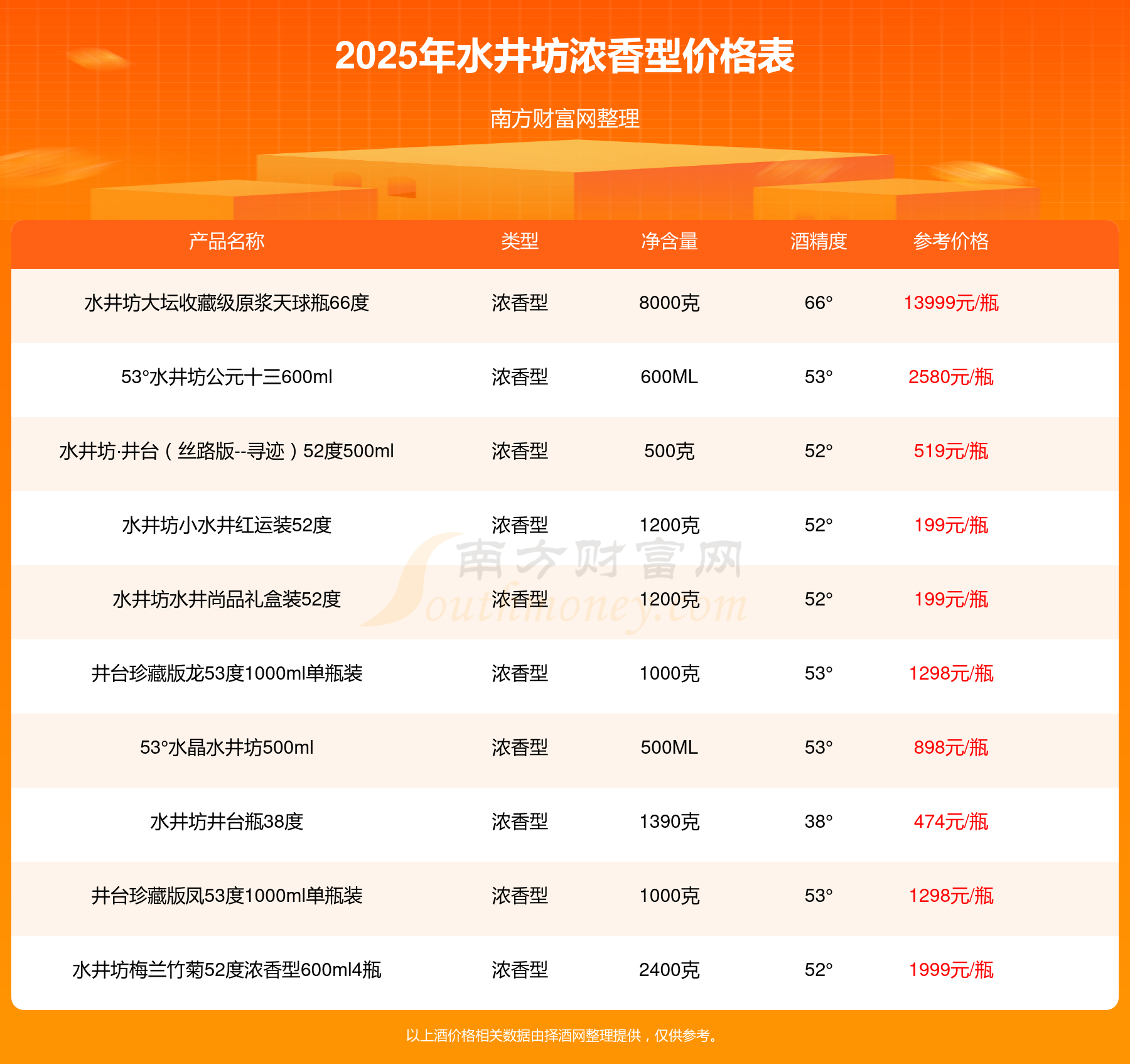 2025年,水井坊濃香型酒價(jià)格最高的是水井坊大壇收藏級(jí)原漿天球瓶66度,參考價(jià)13999元,最低的是水井坊小水井52度500ml,參考價(jià)158元,價(jià)格高低差為13841元。