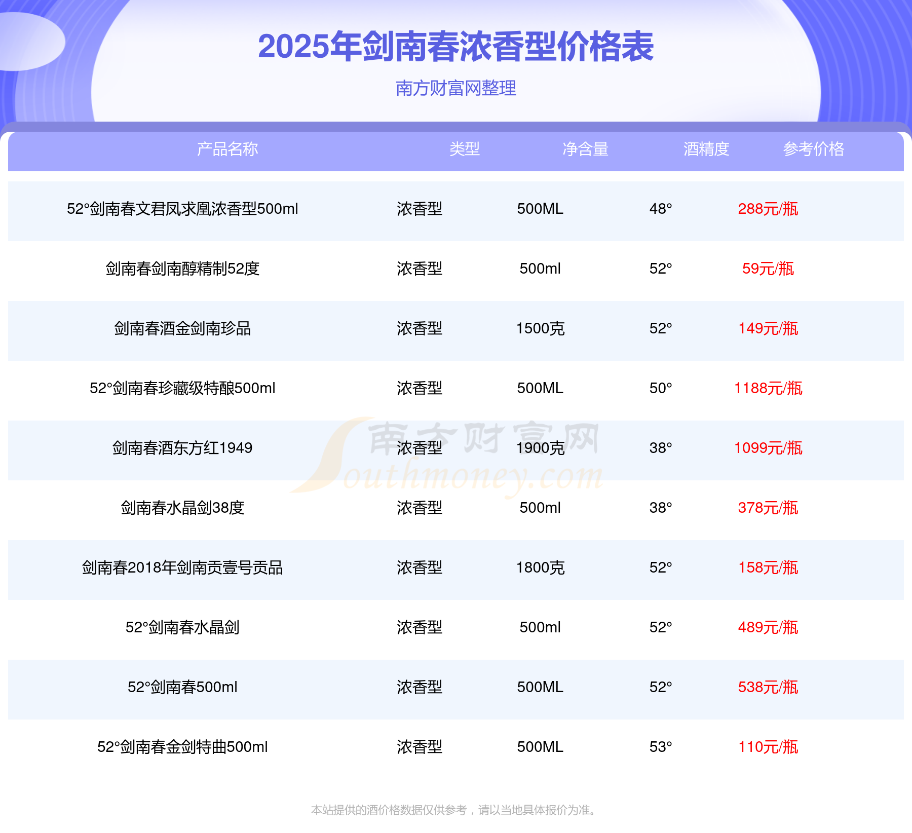 2025年,劍南春濃香型酒價格最高的是劍南春鑒藏52度,參考價1199元,最低的是劍南春劍南醇精制52度,參考價59元,價格高低差為1140元。