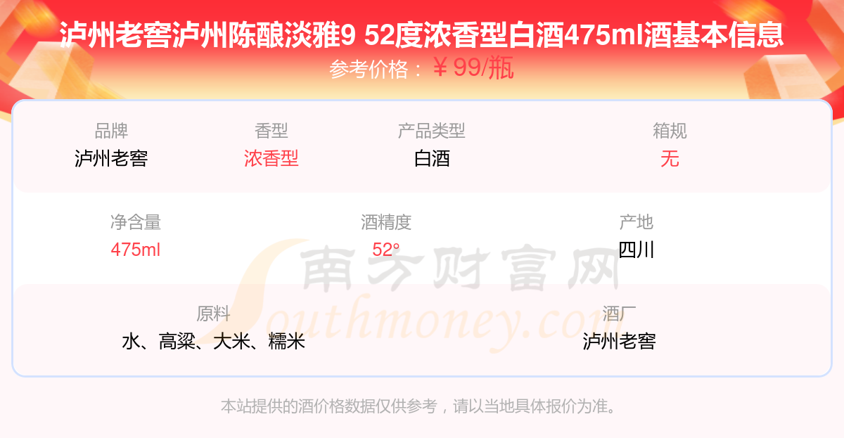 瀘州老窖瀘州陳釀淡雅9 52度濃香型白酒475ml基本信息