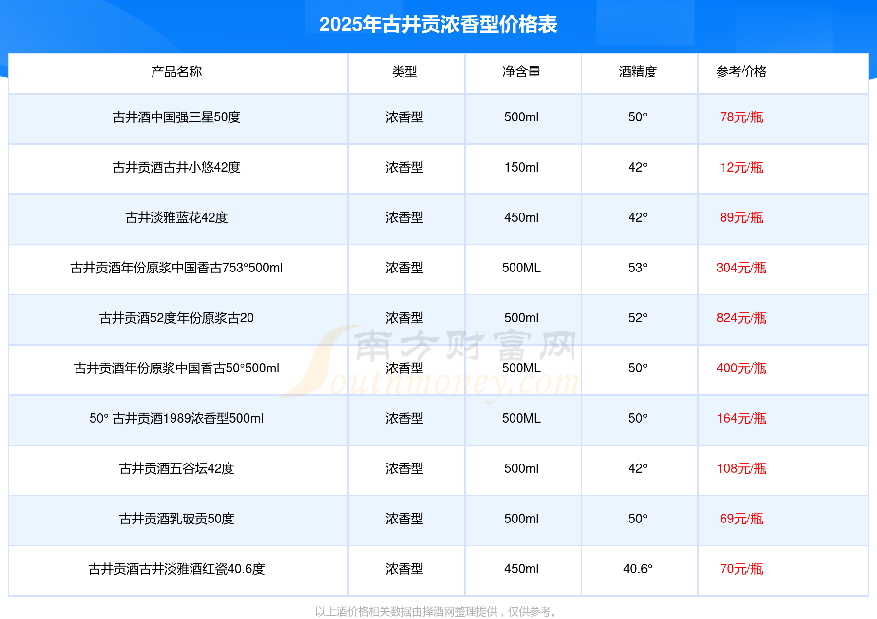 2025年,古井貢酒52度年份原漿古20、古井貢酒年份原漿中國(guó)香古50°500ml、 古井貢酒年份原漿中國(guó)香古753°500ml、古井貢酒50度年份原漿古5等古井貢濃香型酒價(jià)格如下:古井貢酒52度年份原漿古20參考價(jià)824元/瓶、古井貢酒年份原漿中國(guó)香古50°500ml參考價(jià)400元/瓶、 古井貢酒年份原漿中國(guó)香古753°500ml參考價(jià)304元/瓶、古井貢酒50度年份原漿古5參考價(jià)198元/瓶。