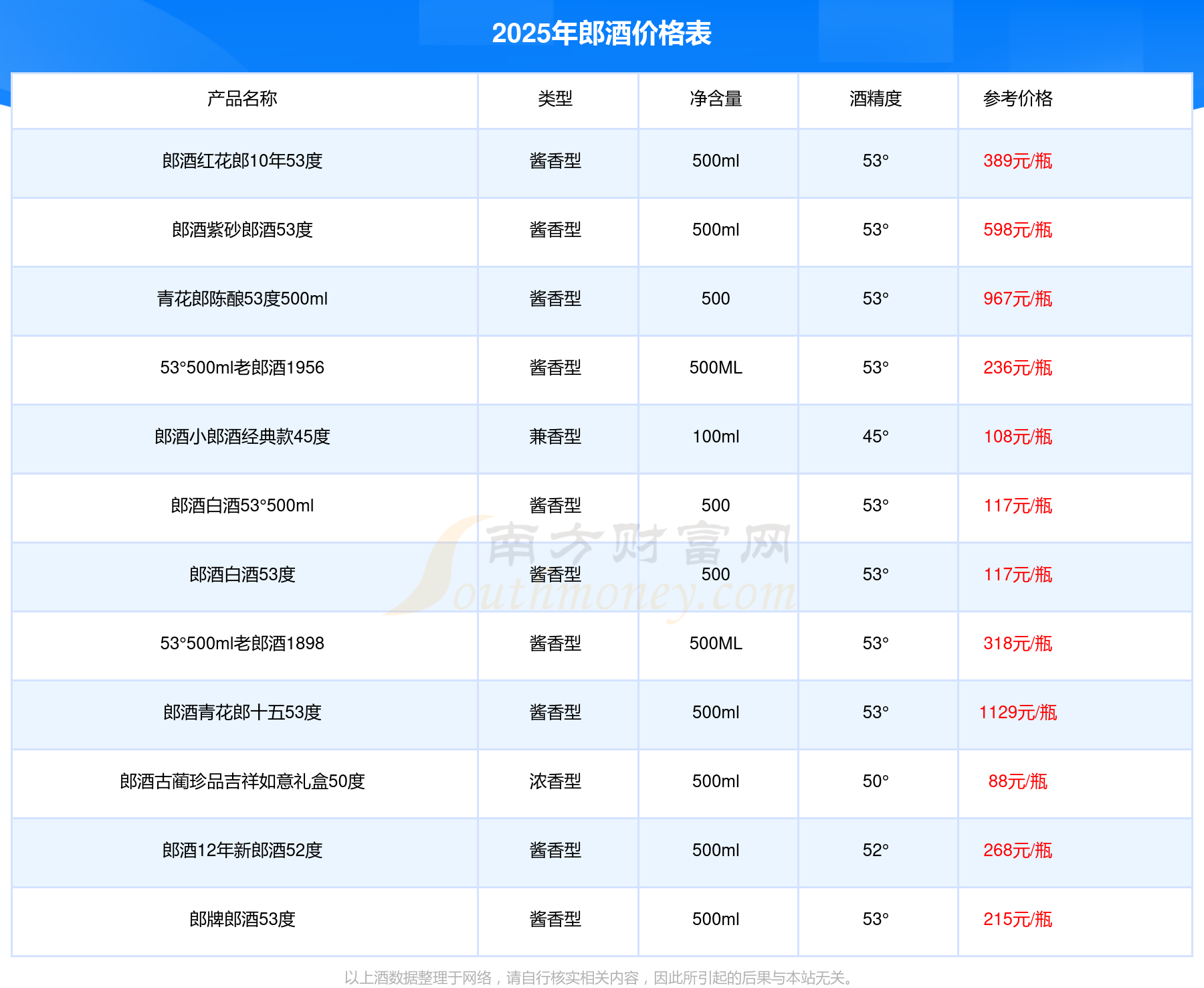 郎酒青花郎十五53度參考價1129元/瓶、青花郎陳釀53度500ml參考價967元/瓶、郎酒紫砂郎酒53度參考價598元/瓶、郎酒紅花郎10年53度參考價389元/瓶、53°500ml老郎酒1898參考價318元/瓶。