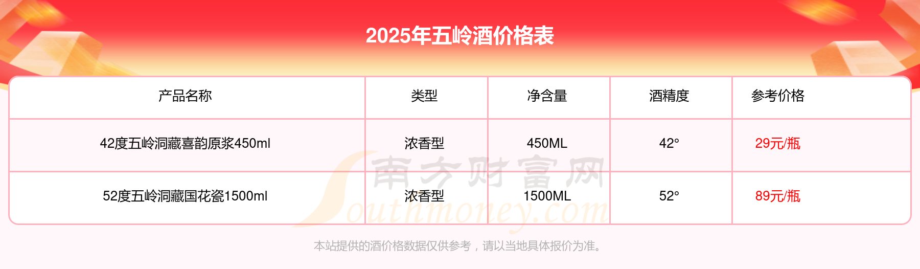 2025年五嶺酒52度五嶺洞藏國花瓷1500ml、42度五嶺洞藏喜韻原漿450ml等最新價格如下:52度五嶺洞藏國花瓷1500ml參考價89元/瓶、42度五嶺洞藏喜韻原漿450ml參考價29元/瓶。