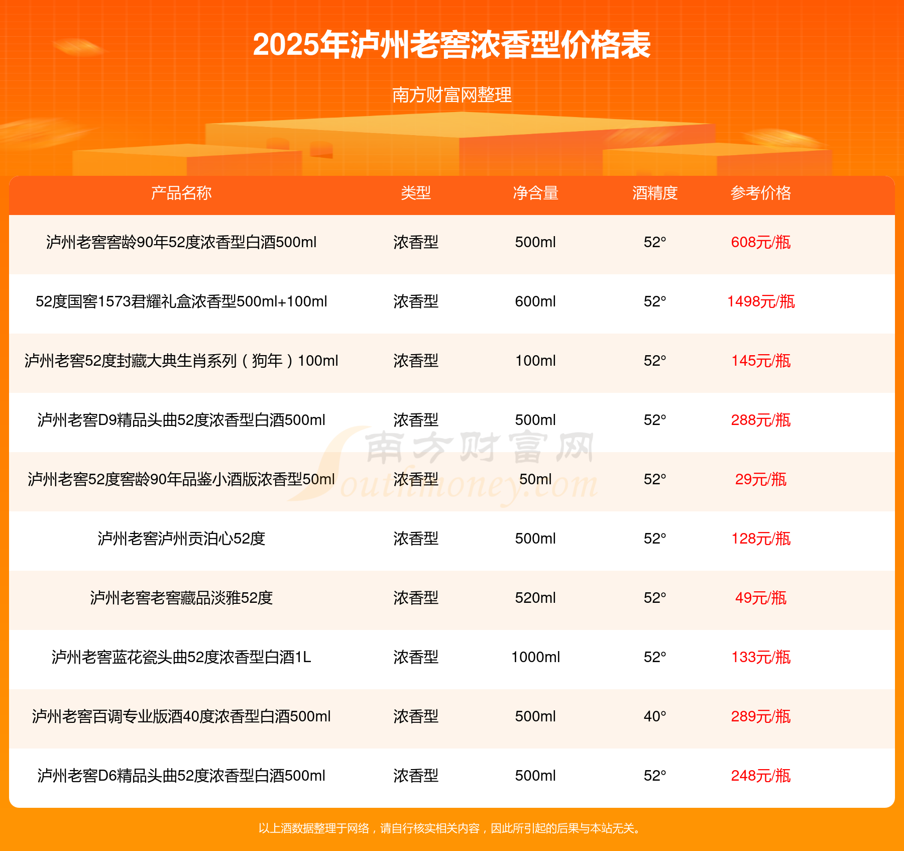 2025年,瀘州老窖國(guó)窖1573春釀鼠兆豐年E 55度、瀘州老窖國(guó)窖1573生命中的那壇酒55度014、瀘州老窖國(guó)窖1573春釀鼠兆豐年A 55度、瀘州老窖國(guó)窖1573生命中的那壇酒55度013濃香型白酒1000ml、瀘州老窖國(guó)窖1573生命中的那壇酒55度009 1000ml、瀘州老窖國(guó)窖1573中國(guó)品味52度濃香型白酒500ml等瀘州老窖濃香型酒價(jià)格如下:瀘州老窖國(guó)窖1573春釀鼠兆豐年E 55度參考價(jià)17999元/瓶、瀘州老窖國(guó)窖1573生命中的那壇酒55度014參考價(jià)9999元/瓶、瀘州老窖國(guó)窖1573春釀鼠兆豐年A 55度參考價(jià)5088元/瓶、瀘州老窖國(guó)窖1573生命中的那壇酒55度013濃香型白酒1000ml參考價(jià)4988元/瓶、瀘州老窖國(guó)窖1573生命中的那壇酒55度009 1000ml參考價(jià)4288元/瓶、瀘州老窖國(guó)窖1573中國(guó)品味52度濃香型白酒500ml參考價(jià)2888元/瓶。