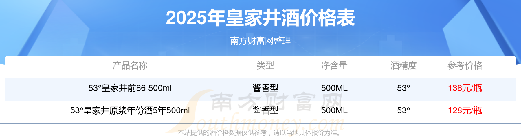 目前,皇家井酒價格最高的酒為53°皇家井前86 500ml,參考價138元/瓶,而皇家井酒價格最低的是53°皇家井原漿年份酒5年500ml,參考價128元/瓶,價格高低差為10元/瓶。