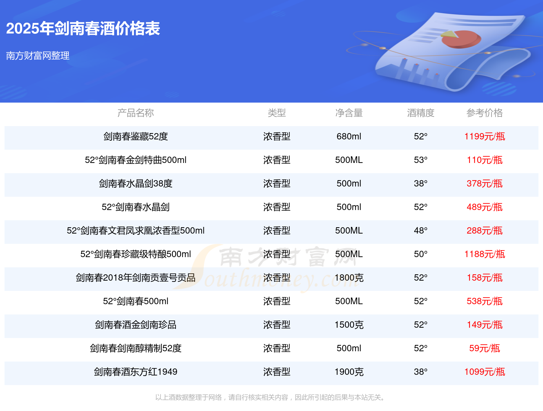 劍南春酒最新價(jià)格2025:劍南春鑒藏52度參考價(jià)1199元/瓶、52°劍南春珍藏級(jí)特釀500ml參考價(jià)1188元/瓶、劍南春酒東方紅1949參考價(jià)1099元/瓶、52°劍南春500ml參考價(jià)538元/瓶、52°劍南春水晶劍參考價(jià)489元/瓶、劍南春水晶劍38度參考價(jià)378元/瓶、52°劍南春文君鳳求凰濃香型500ml參考價(jià)288元/瓶、劍南春2018年劍南貢壹號(hào)貢品參考價(jià)158元/瓶。