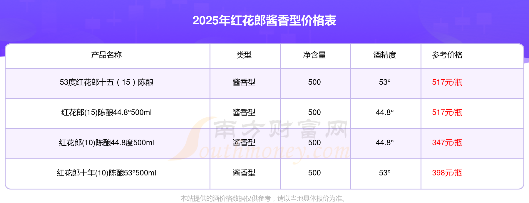 2025年紅花郎醬香型酒53度紅花郎十五(15)陳釀、紅花郎(15)陳釀44.8°500ml、紅花郎十年(10)陳釀53°500ml等最新價(jià)格如下:53度紅花郎十五(15)陳釀參考價(jià)517元/瓶、紅花郎(15)陳釀44.8°500ml參考價(jià)517元/瓶、紅花郎十年(10)陳釀53°500ml參考價(jià)398元/瓶。