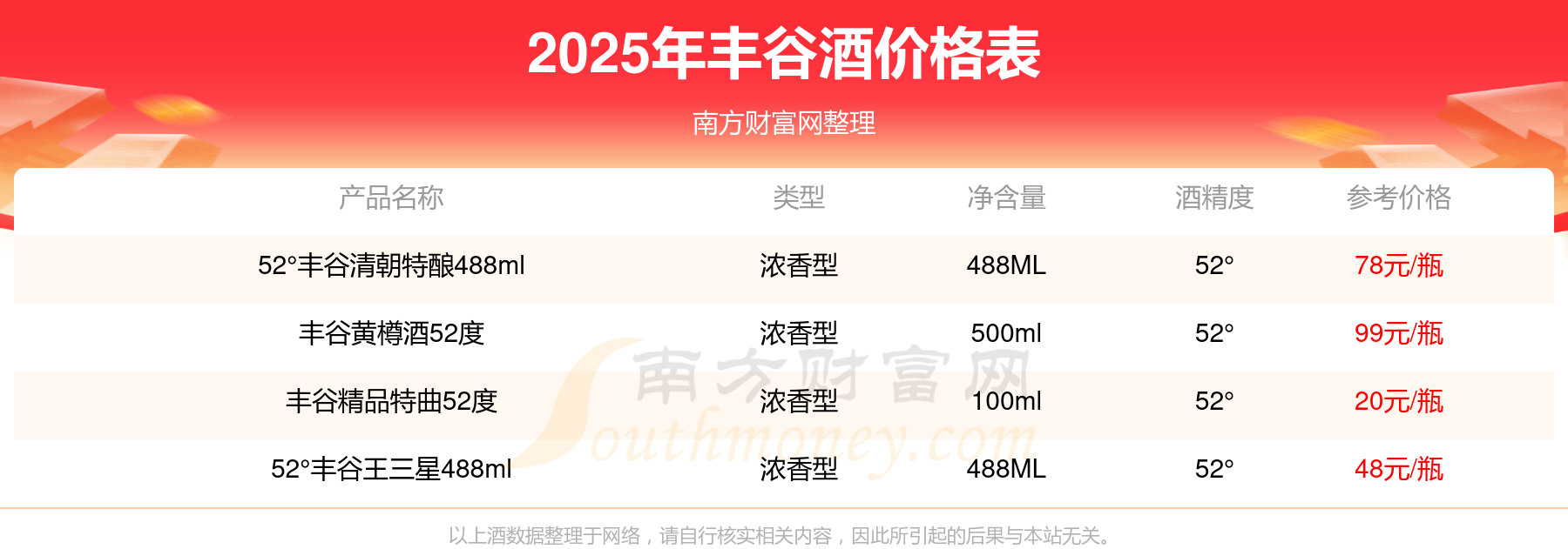 2025年,豐谷黃樽酒52度、52°豐谷清朝特釀488ml、52°豐谷王三星488ml等豐谷酒價格如下:豐谷黃樽酒52度參考價99元/瓶、52°豐谷清朝特釀488ml參考價78元/瓶、52°豐谷王三星488ml參考價48元/瓶。