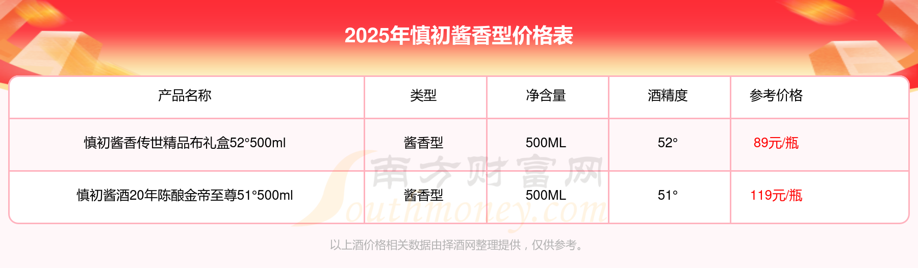 慎初醬酒20年陳釀金帝至尊51°500ml參考價(jià)119元/瓶、慎初醬香傳世精品布禮盒52°500ml參考價(jià)89元/瓶。