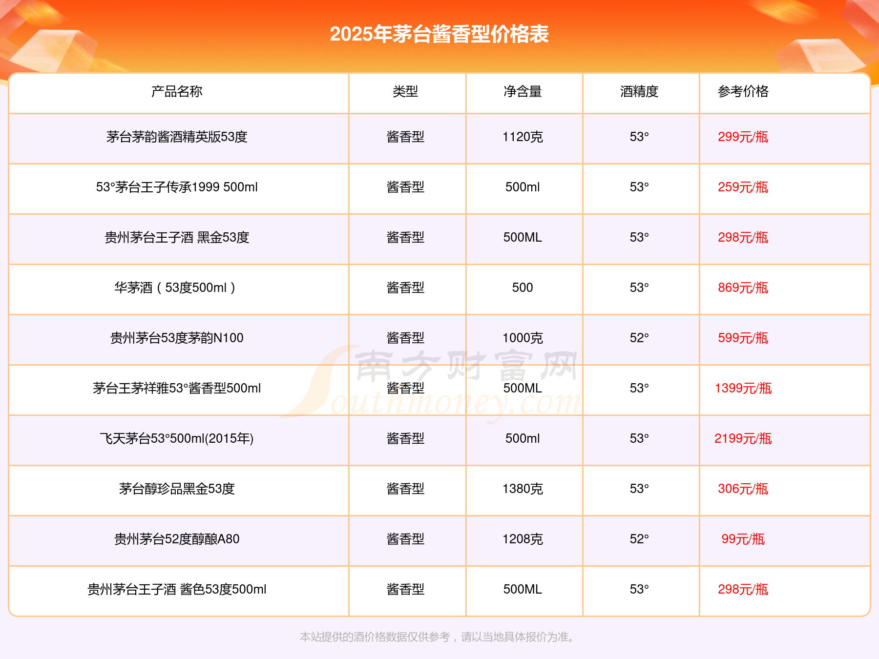 2025年茅臺醬香型酒華茅鑒藏 醬香型白酒 3L 53°、53度五星茅臺生肖酒丁酉雞年、貴州茅臺己亥豬年生肖酒53°500ml等最新價格如下:華茅鑒藏 醬香型白酒 3L 53°參考價8388元/瓶、53度五星茅臺生肖酒丁酉雞年參考價2798元/瓶、貴州茅臺己亥豬年生肖酒53°500ml參考價2699元/瓶。