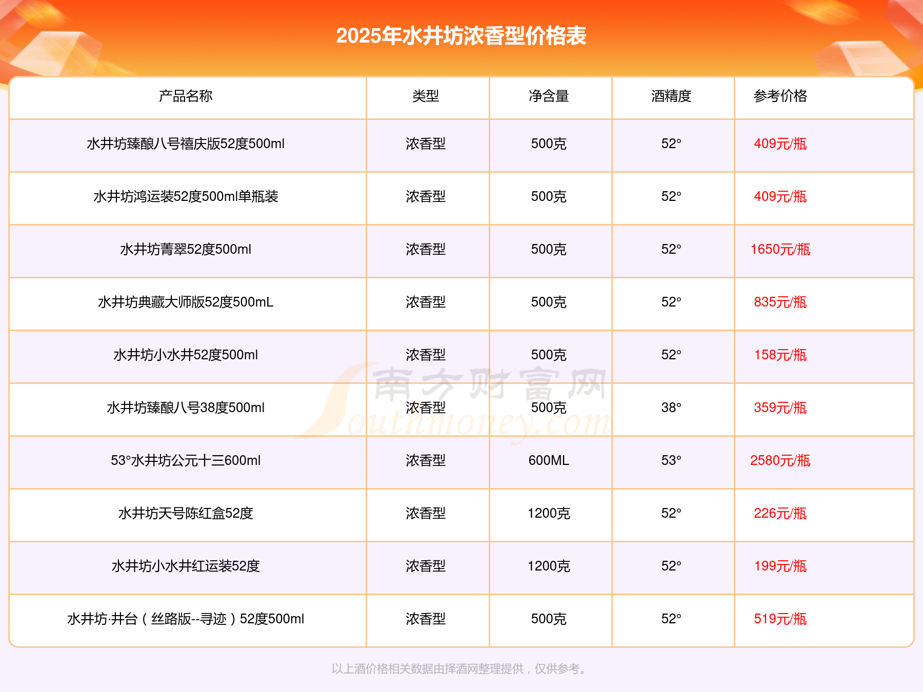 2025年,水井坊濃香型酒價格最高的是水井坊大壇收藏級原漿天球瓶66度,參考價13999元,最低的是水井坊小水井52度500ml,參考價158元,價格高低差為13841元。