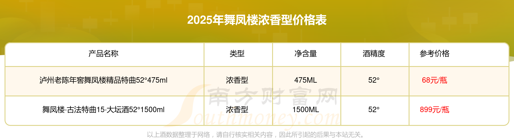 2025舞鳳樓濃香型酒最新價格:舞鳳樓·古法特曲15·大壇酒52°1500ml參考價899元/瓶、瀘州老陳年窖舞鳳樓精品特曲52°475ml參考價68元/瓶。