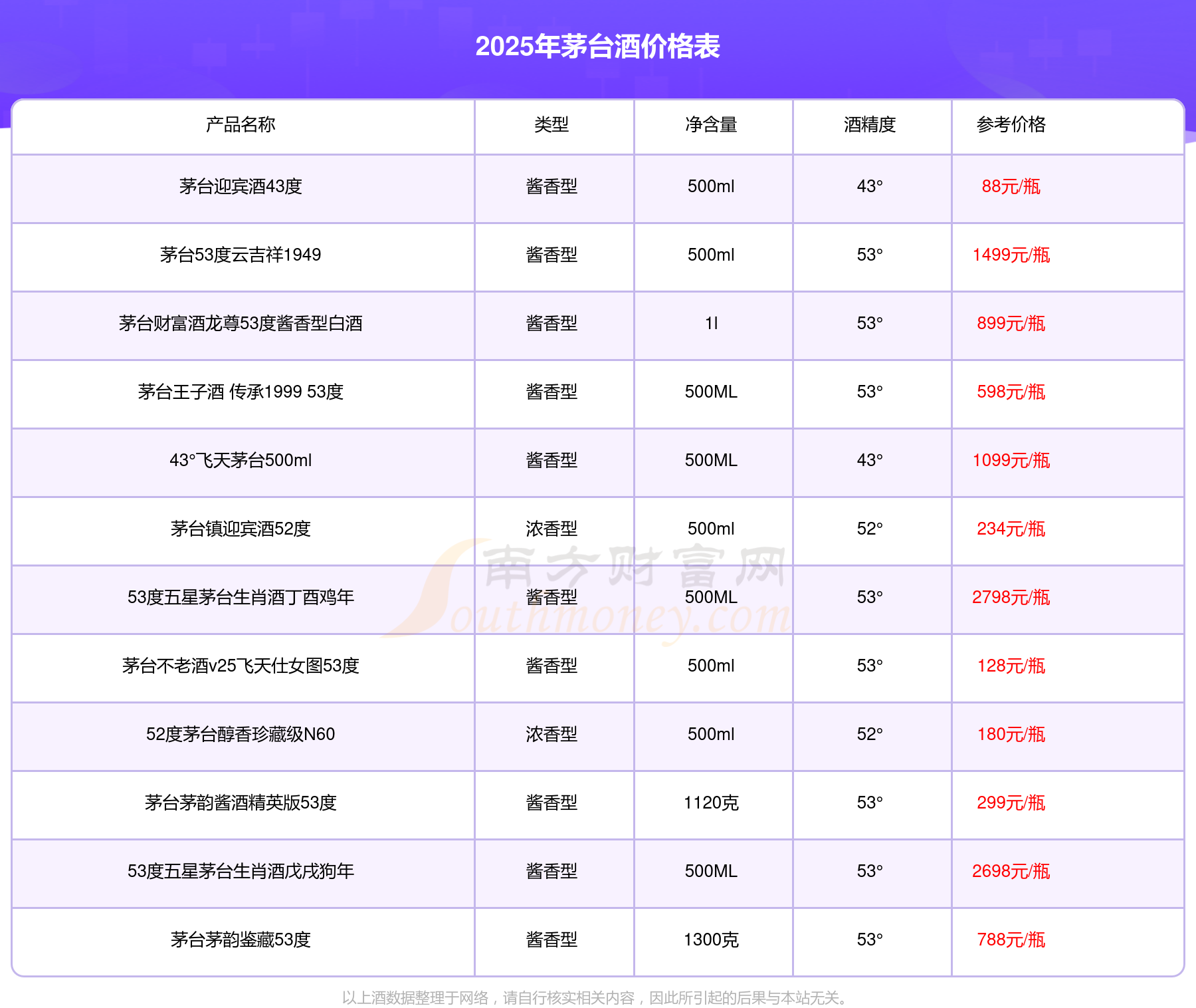 2025年,華茅鑒藏 醬香型白酒 3L 53°、53度五星茅臺生肖酒丁酉雞年、貴州茅臺己亥豬年生肖酒53°500ml、53度五星茅臺生肖酒戊戌狗年、飛天茅臺53°500ml(2015年)、茅臺王子酒己亥豬年生肖紀(jì)念酒53度2.5L、茅臺1935醬香型53度等茅臺酒價格如下:華茅鑒藏 醬香型白酒 3L 53°參考價8388元/瓶、53度五星茅臺生肖酒丁酉雞年參考價2798元/瓶、貴州茅臺己亥豬年生肖酒53°500ml參考價2699元/瓶、53度五星茅臺生肖酒戊戌狗年參考價2698元/瓶、飛天茅臺53°500ml(2015年)參考價2199元/瓶、茅臺王子酒己亥豬年生肖紀(jì)念酒53度2.5L參考價2099元/瓶、茅臺1935醬香型53度參考價1799元/瓶。