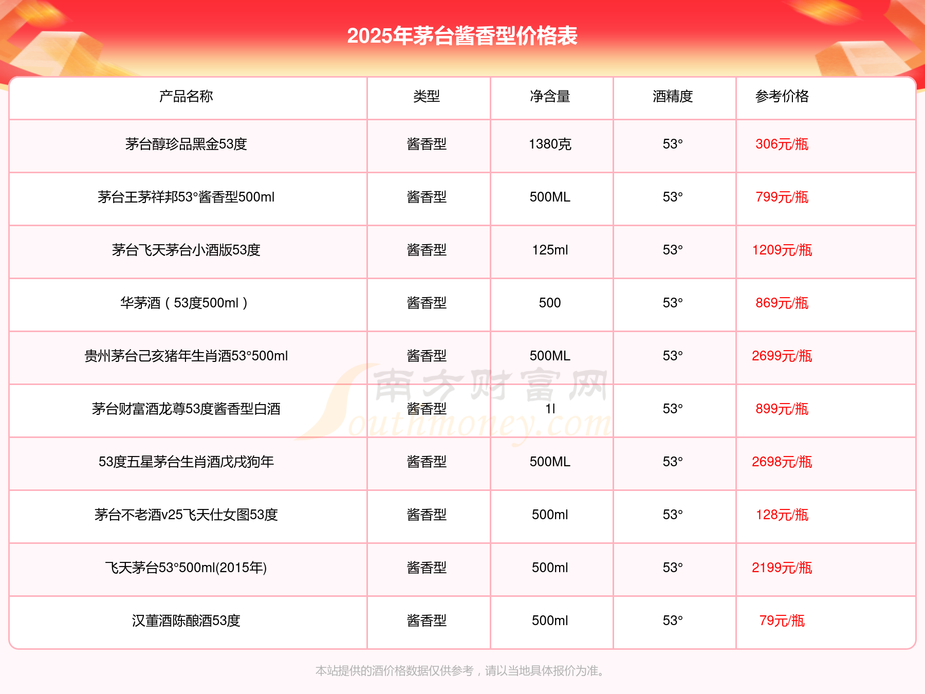 2025年茅臺醬香型價格最高的酒是華茅鑒藏 醬香型白酒 3L 53°,參考價8388元/瓶,最低的是漢董酒陳釀酒53度,參考價79元/瓶,價格高低差為8309元/瓶。