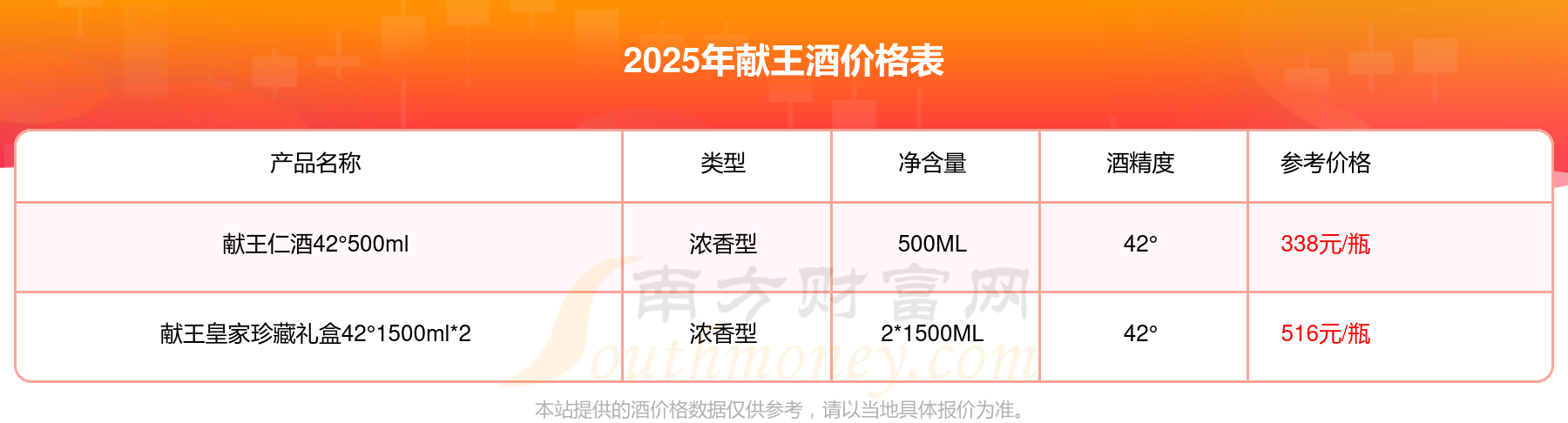 目前,獻王酒價格最高的酒為獻王皇家珍藏禮盒42°1500ml*2,參考價516元/瓶,而獻王酒價格最低的是獻王仁酒42°500ml,參考價338元/瓶,價格高低差為178元/瓶。