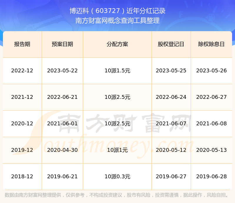 博邁科最新一次公布的分紅方案:10派1.5元。