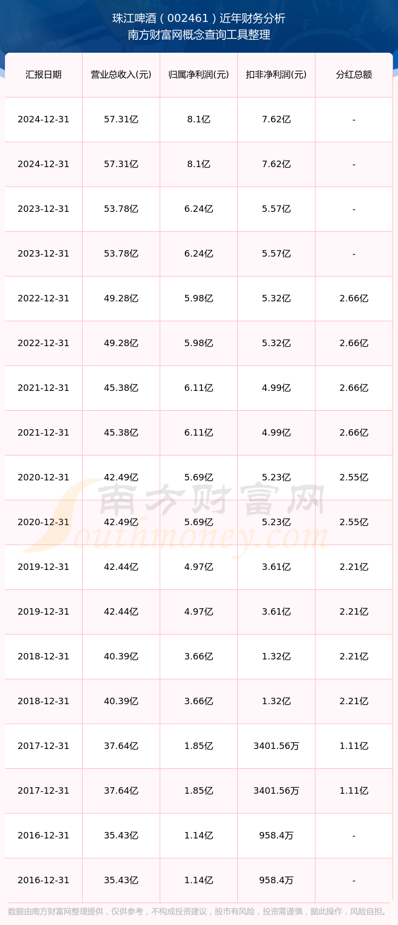 珠江啤酒公司2024年實現(xiàn)營業(yè)收入57.31億元,同比增長6.56%;凈利潤8.1億元,同比增長29.95%;毛利率46.3%。