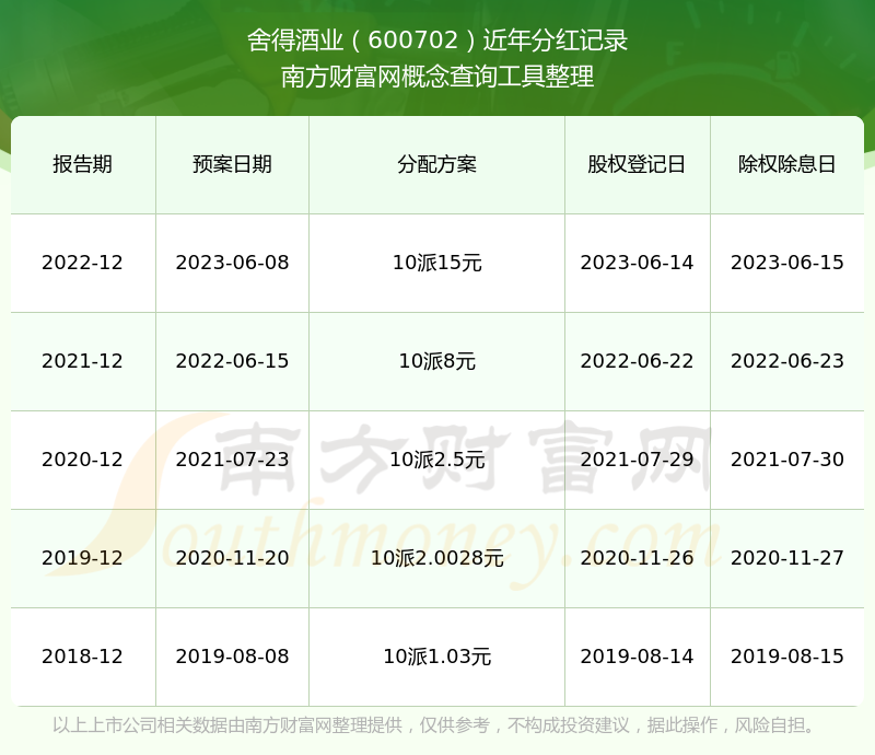 舍得酒業(yè)最新一次公布的分紅方案為10派15元。本次權(quán)益分派股權(quán)登記日為2023年6月14日,除權(quán)除息日為2023年6月15日,派息日為2023年6月15日。