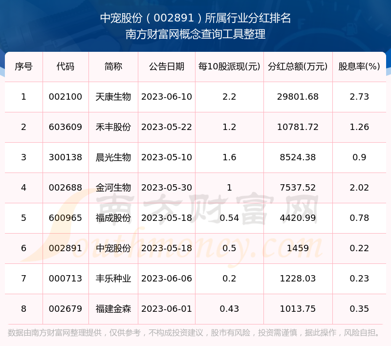 按照南方財富網(wǎng)趨勢選股系統(tǒng)統(tǒng)計,中寵股份所屬行業(yè)為寵物經(jīng)濟(jì)行業(yè),寵物經(jīng)濟(jì)行業(yè)分紅排名情況如下表: